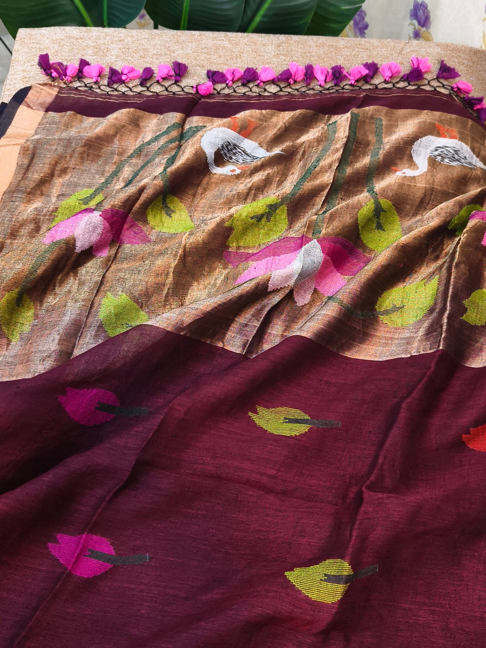 A handloom linen by linen Jamdani saree is a premium, handcrafted garment that blends the rustic, airy texture of linen with the soft sheen and strength of linen, adorned with intricate, hand-woven Jamdani motifs.