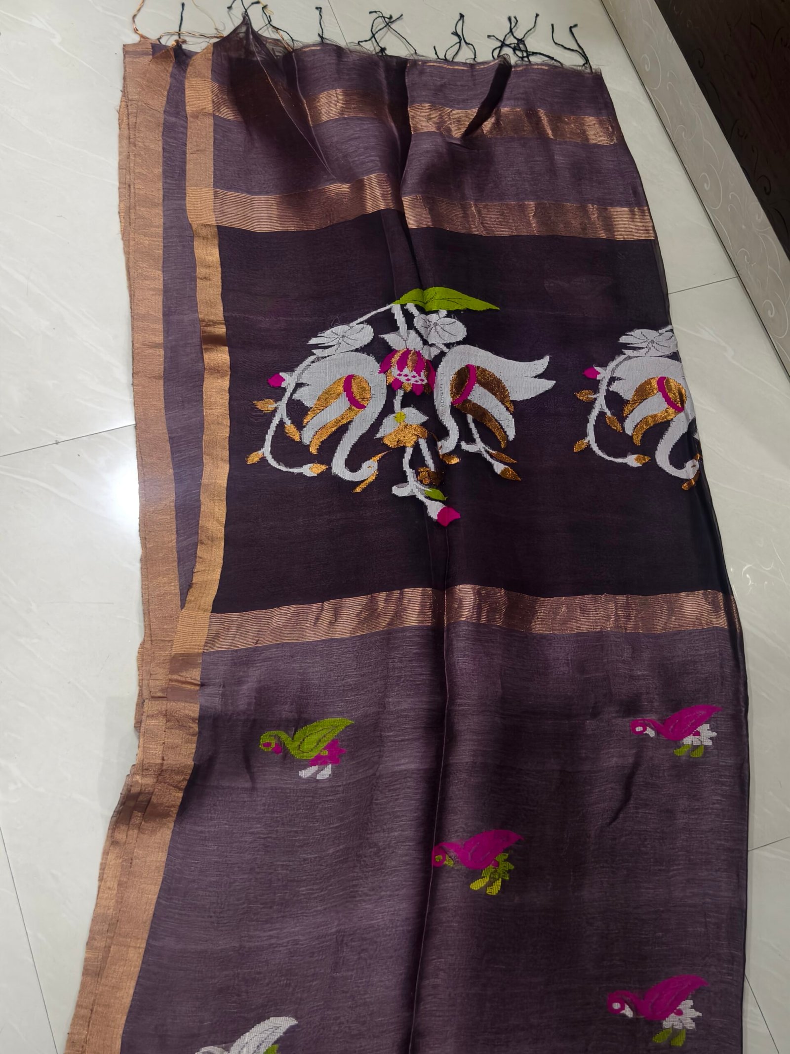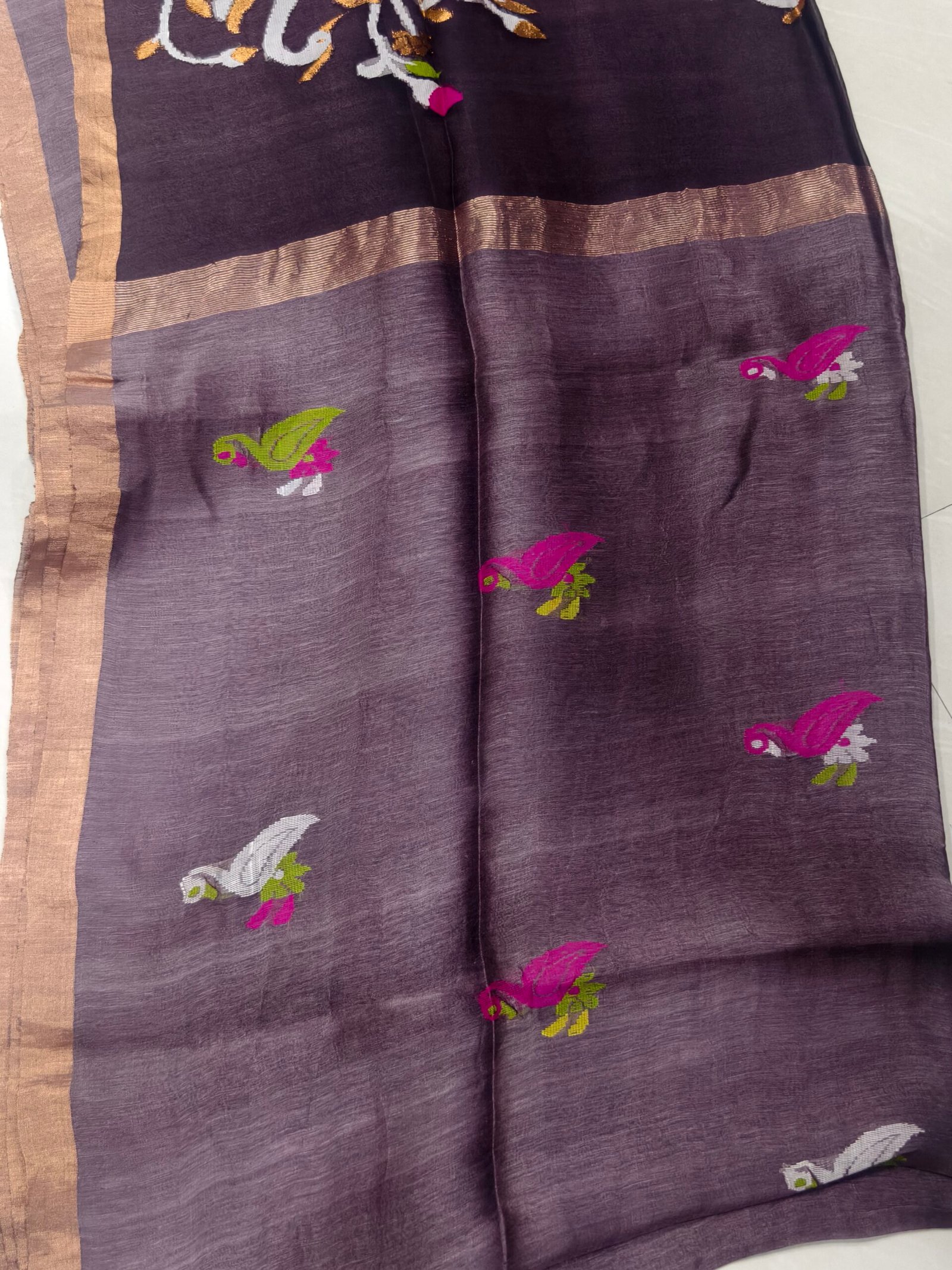 Tissue silk is a delicate, lightweight, slightly sheer silk fabric known for its smooth texture and subtle shimmer. It’s often woven with very fine silk threads and may include metallic yarn (zari) to add a shimmering effect. This makes it especially popular for ethereal, elegant sarees and traditional garments that drape beautifully and feel airy to wear.