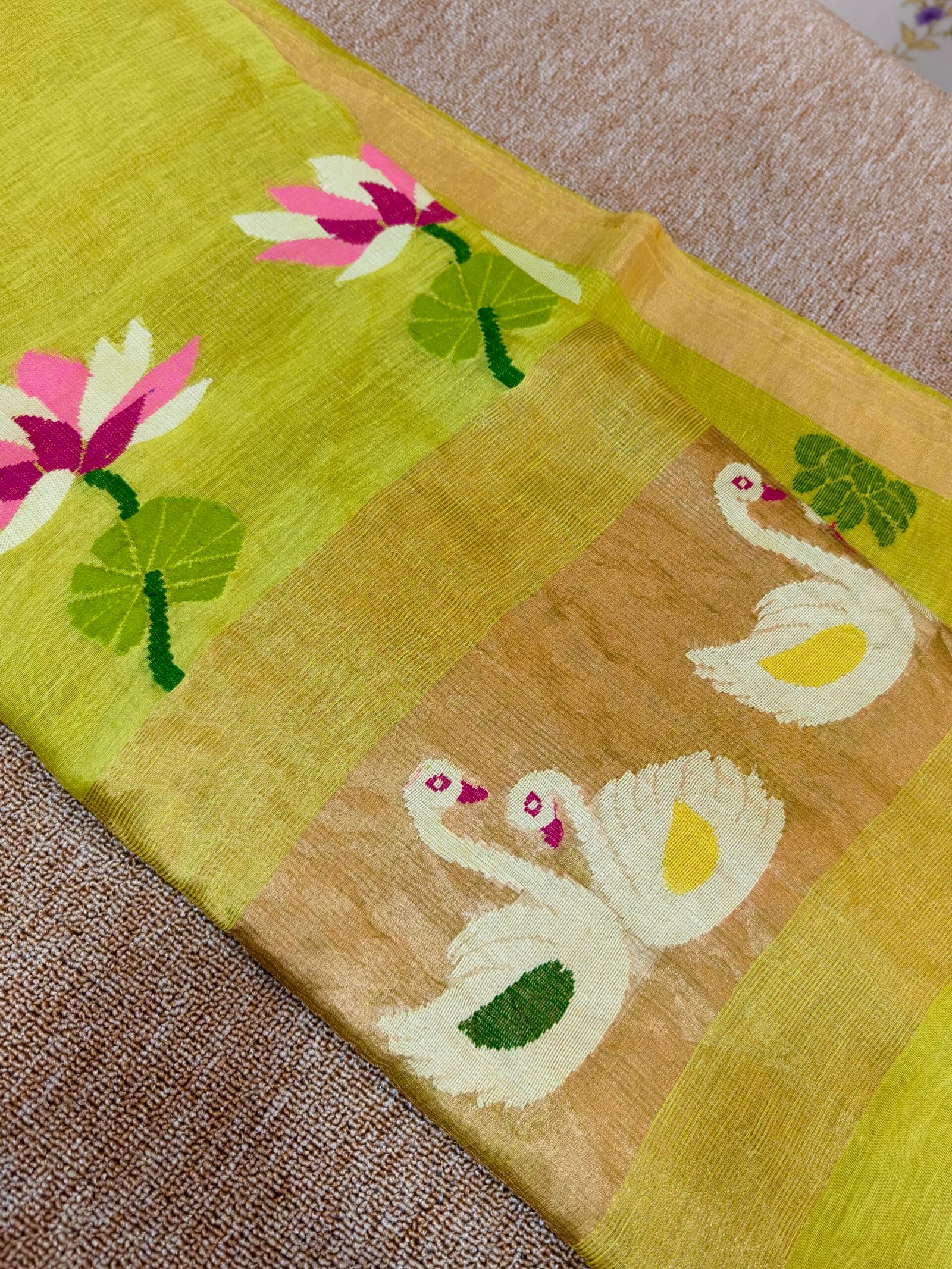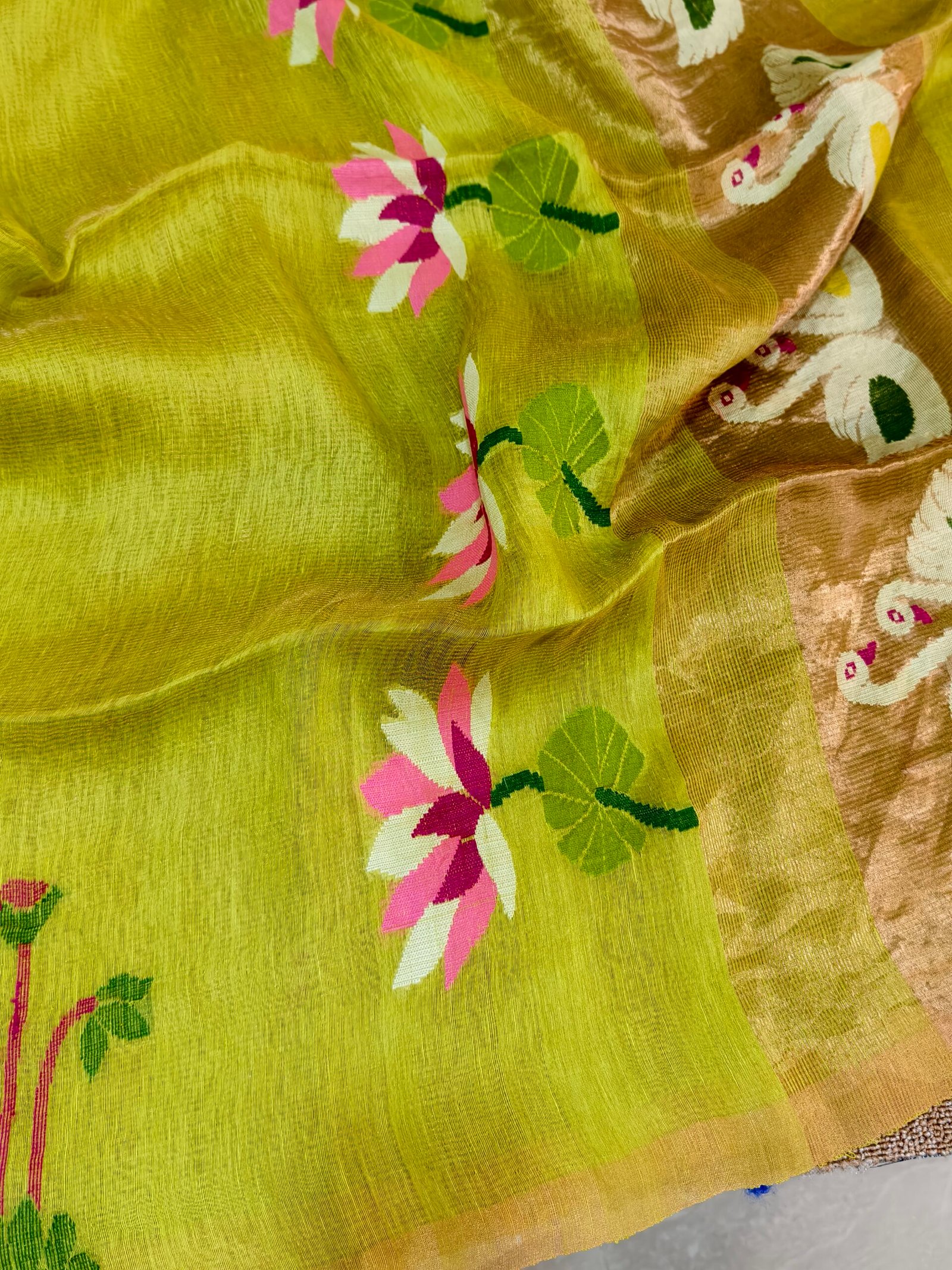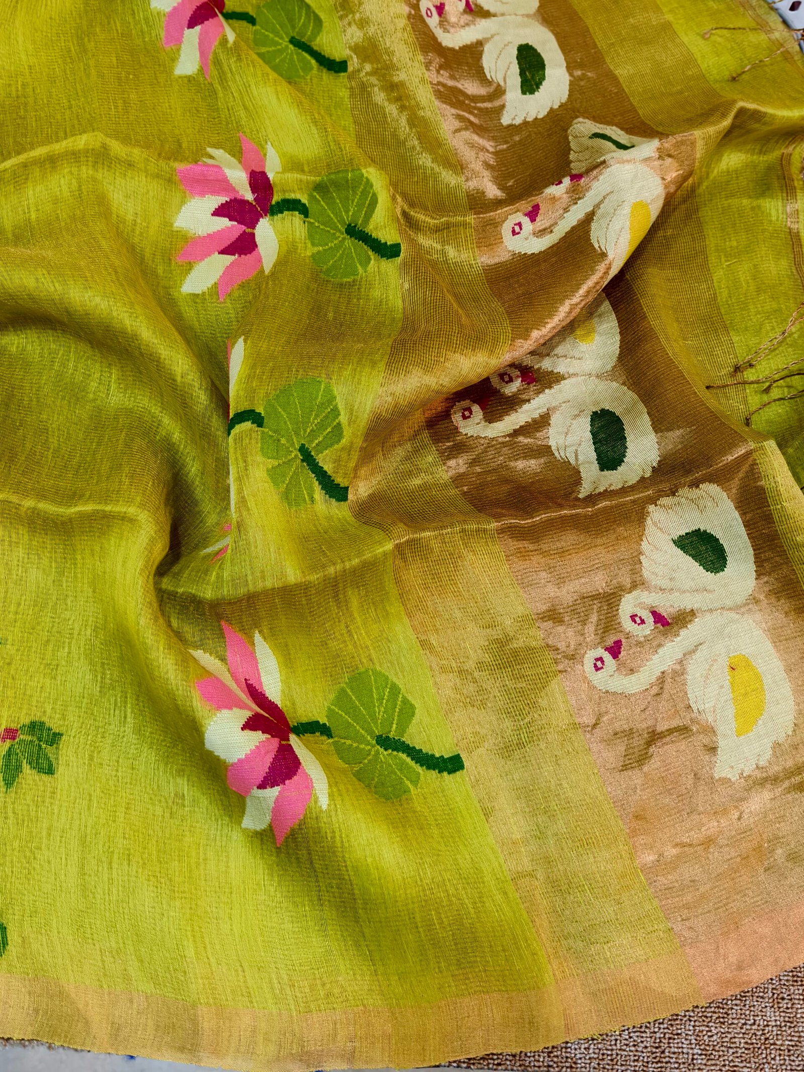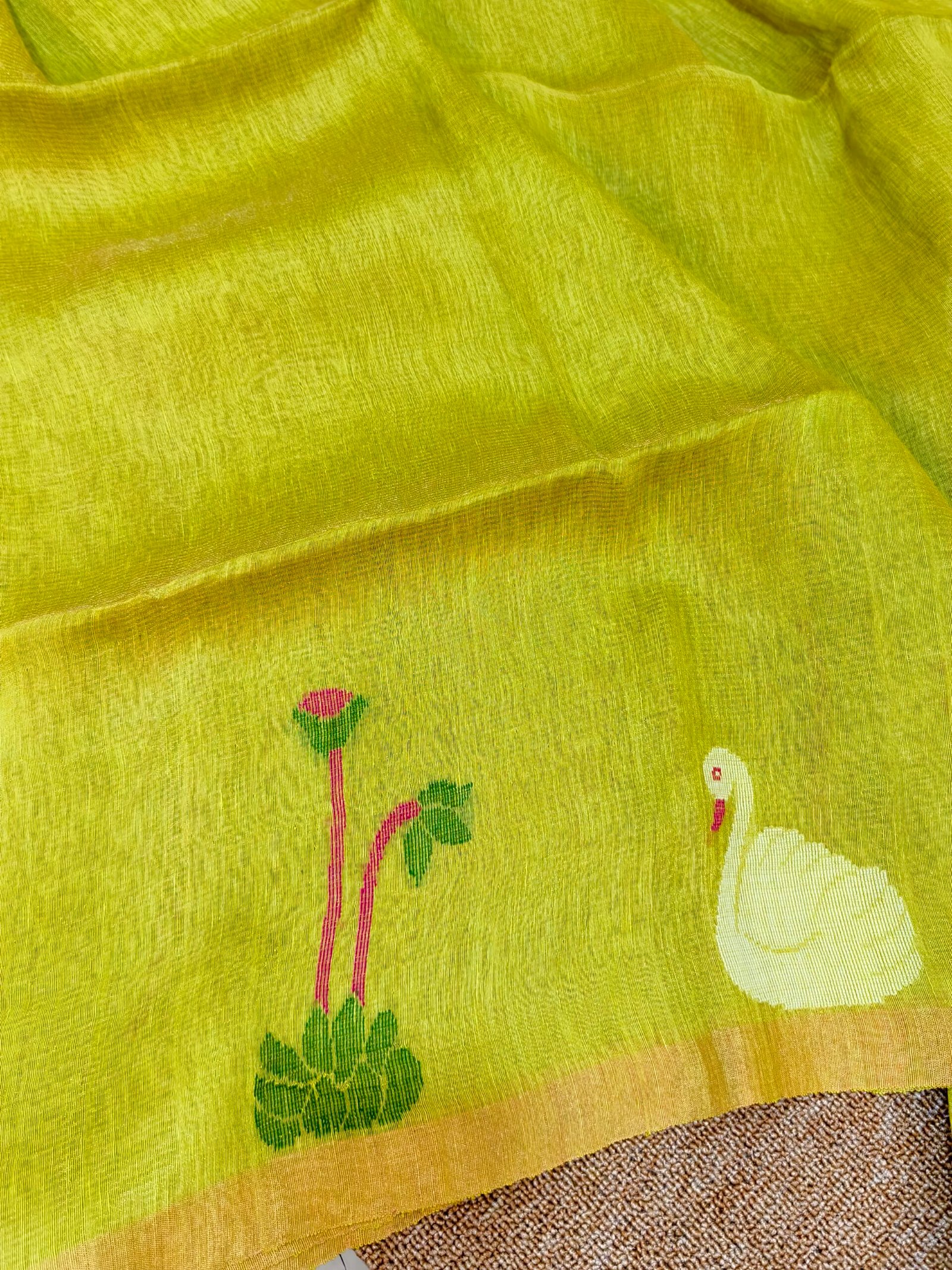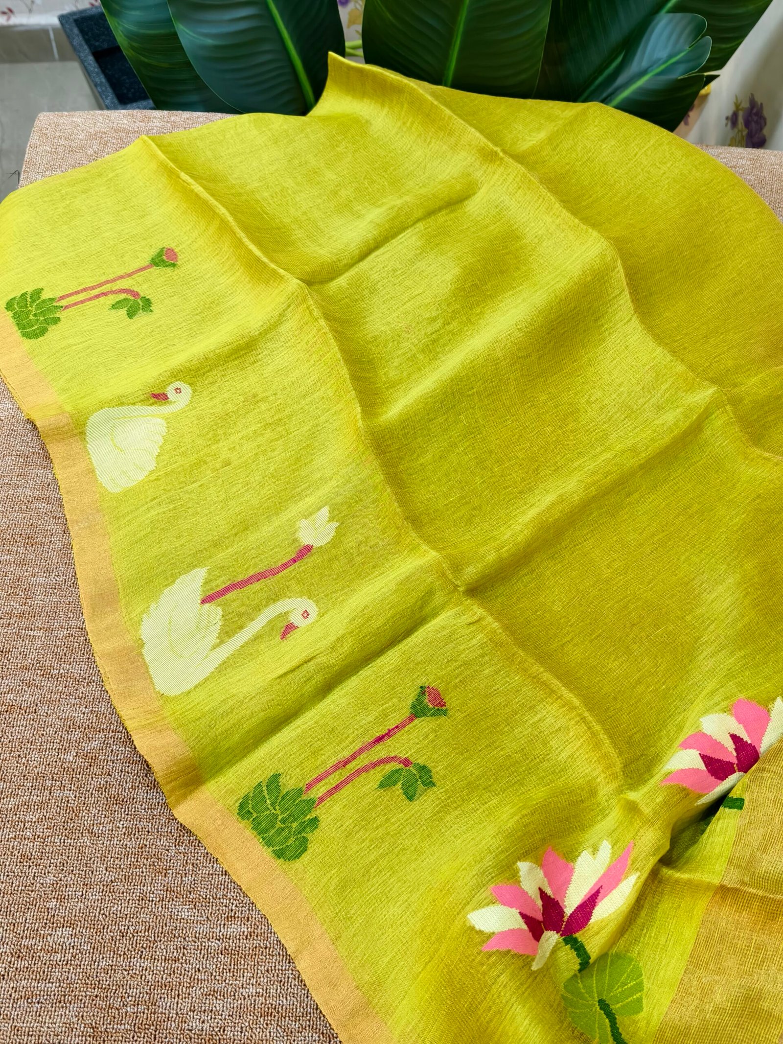 Crafted from a premium linen-silk blend, this saree offers the perfect balance of comfort and elegance. The linen lends a light, breathable, slightly crisp feel, while silk adds a soft sheen and smooth drape. Being handwoven, the fabric carries a natural richness and subtle irregularities that reflect true artisanal craftsmanship.
