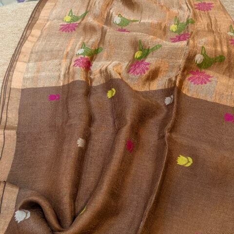 A handloom linen silk saree with a Jamdhani pallu is a graceful fusion of airy texture and intricate heritage weaving.