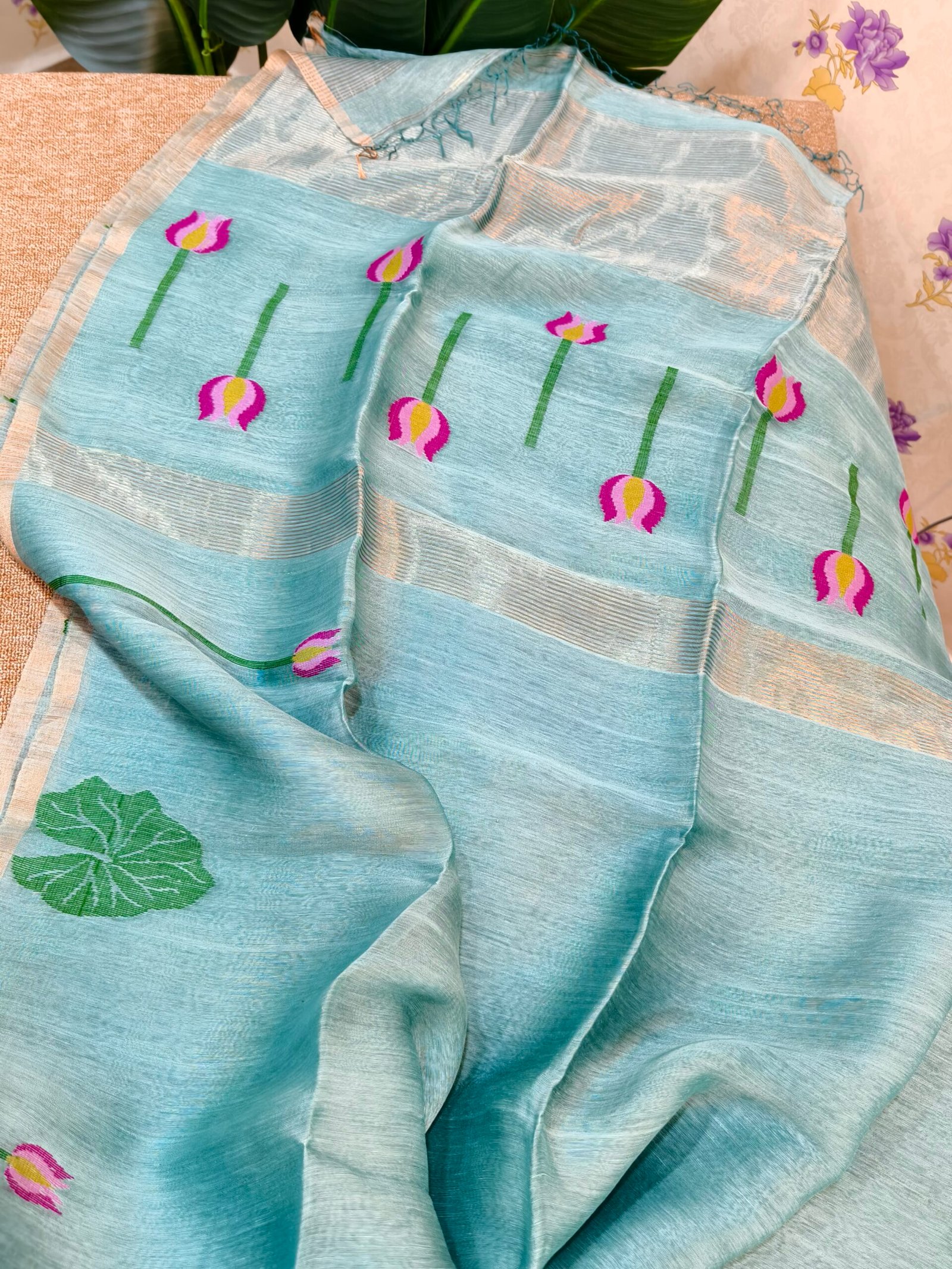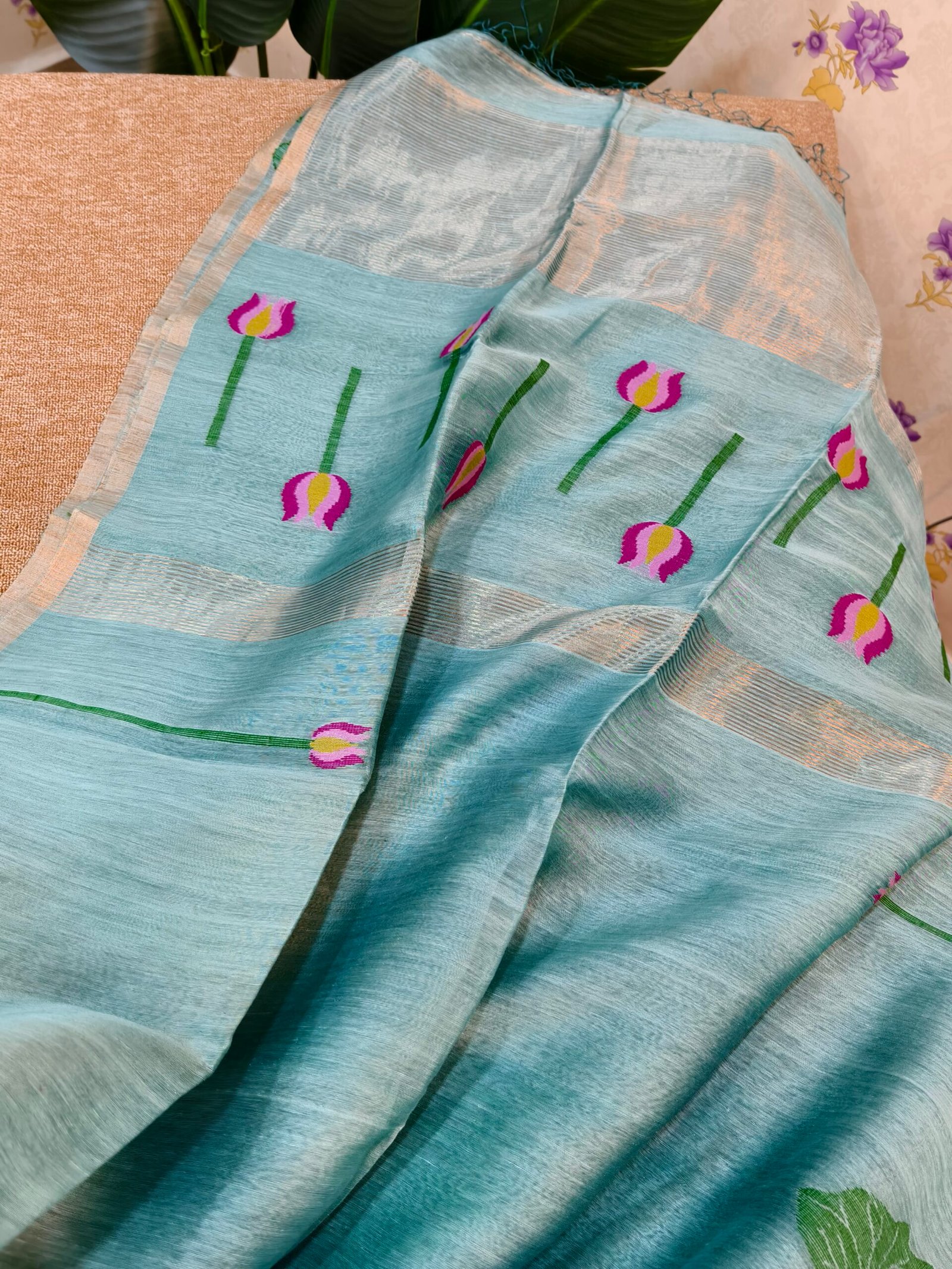 A handloom linen-silk Jamdani saree is a premium, handcrafted garment that blends the rustic, airy texture of linen with the soft sheen and strength of silk, adorned with intricate, hand-woven Jamdani motifs.