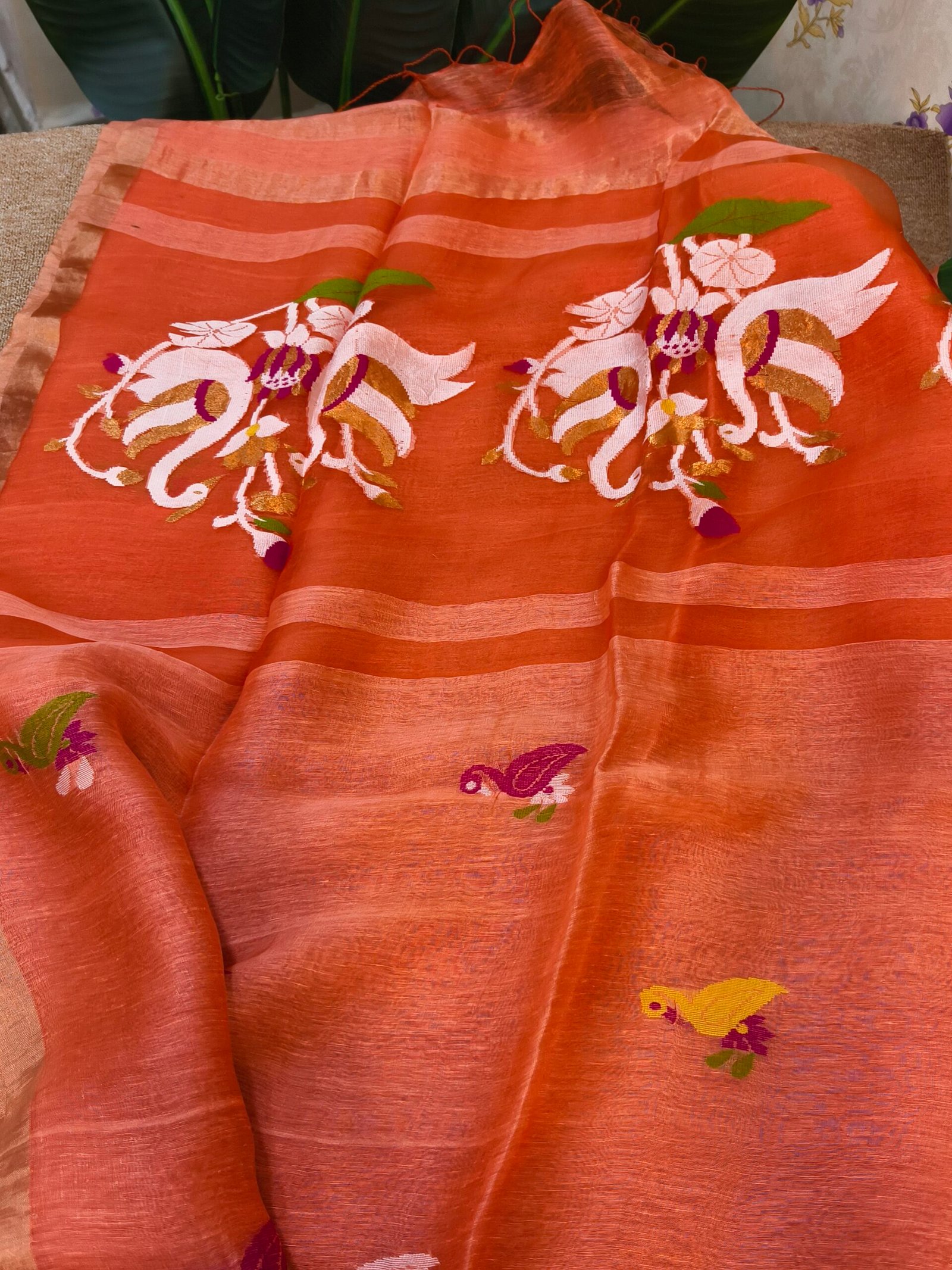 Tissue silk is a delicate, lightweight, slightly sheer silk fabric known for its smooth texture and subtle shimmer. It’s often woven with very fine silk threads and may include metallic yarn (zari) to add a shimmering effect. This makes it especially popular for ethereal, elegant sarees and traditional garments that drape beautifully and feel airy to wear.