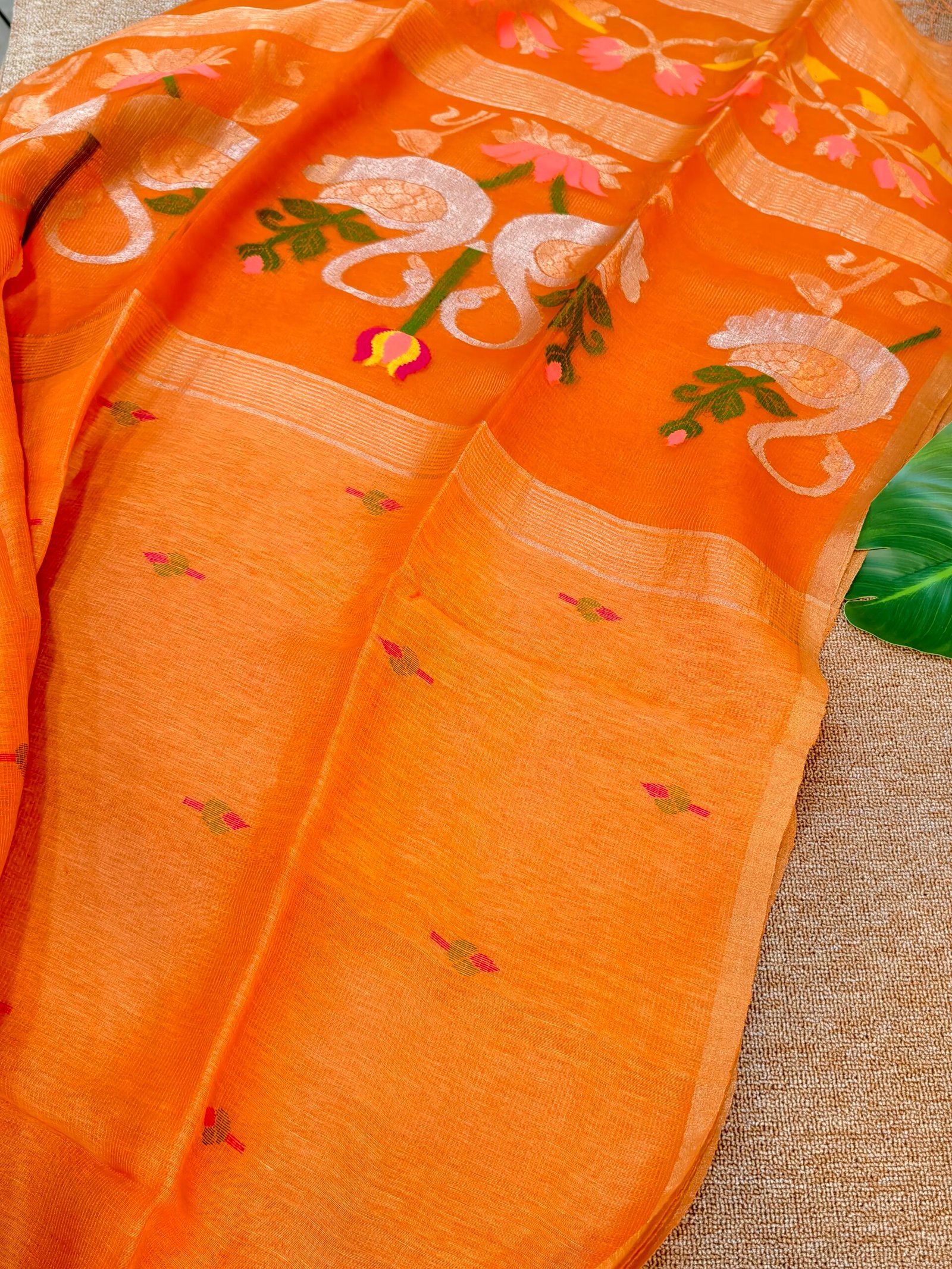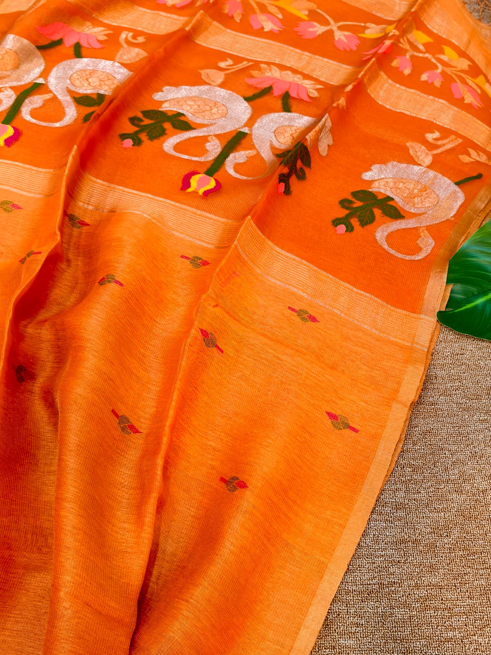This exquisite Linen Tissue Silk Jamdhani features an elegant swan motif, symbolizing grace, purity, and timeless beauty. Handwoven on traditional looms, the fabric blends breathable linen with the softness of silk and the luminous touch of tissue (metallic yarn), creating a rich yet airy texture.