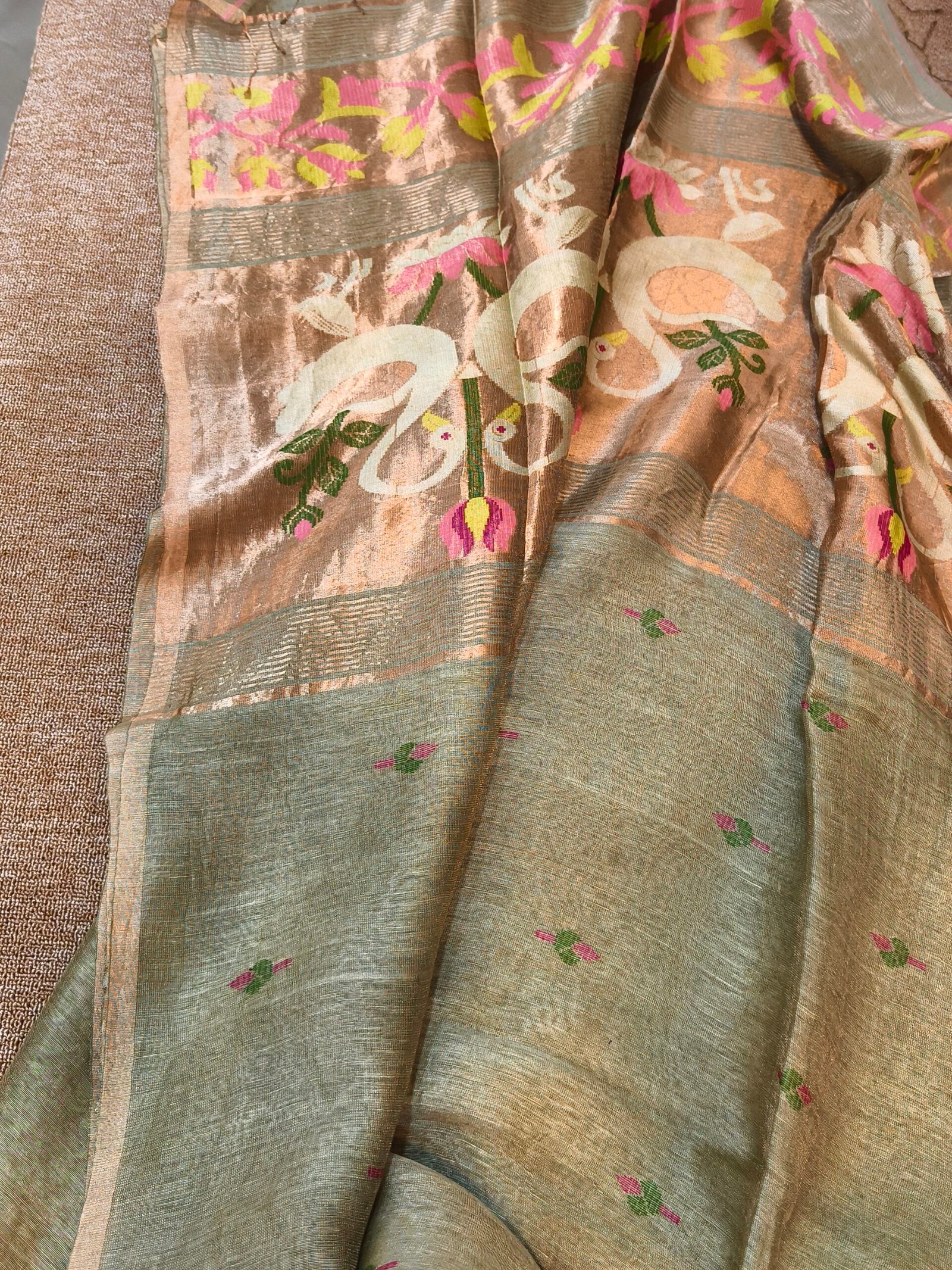 This exquisite Linen Tissue Silk Jamdhani features an elegant swan motif, symbolizing grace, purity, and timeless beauty. Handwoven on traditional looms, the fabric blends breathable linen with the softness of silk and the luminous touch of tissue (metallic yarn), creating a rich yet airy texture.