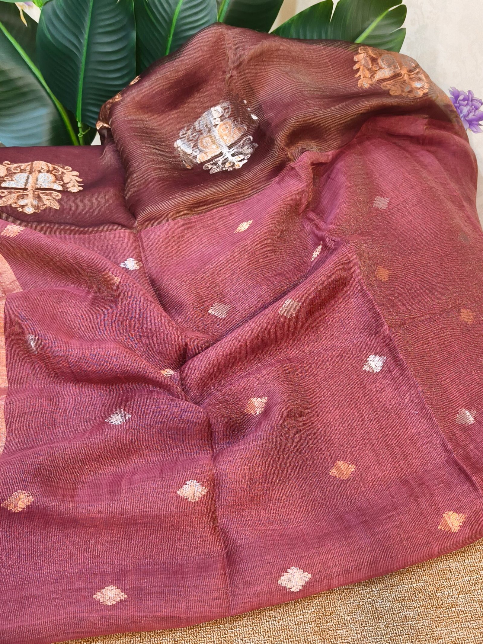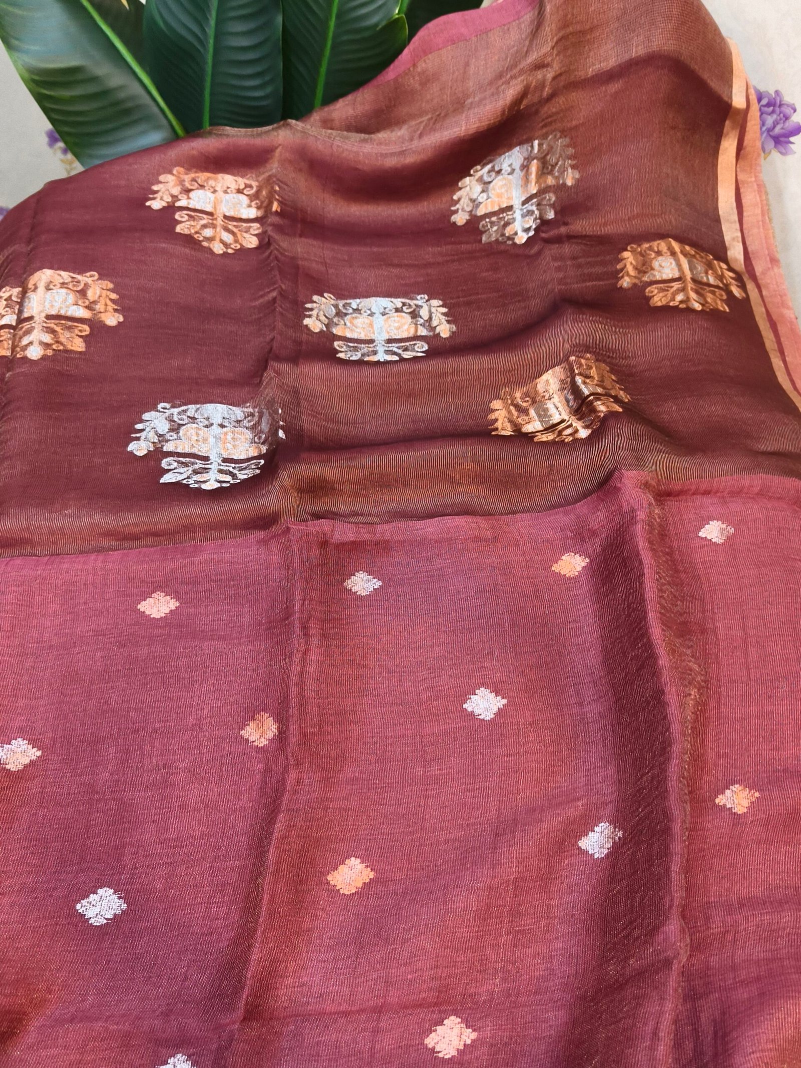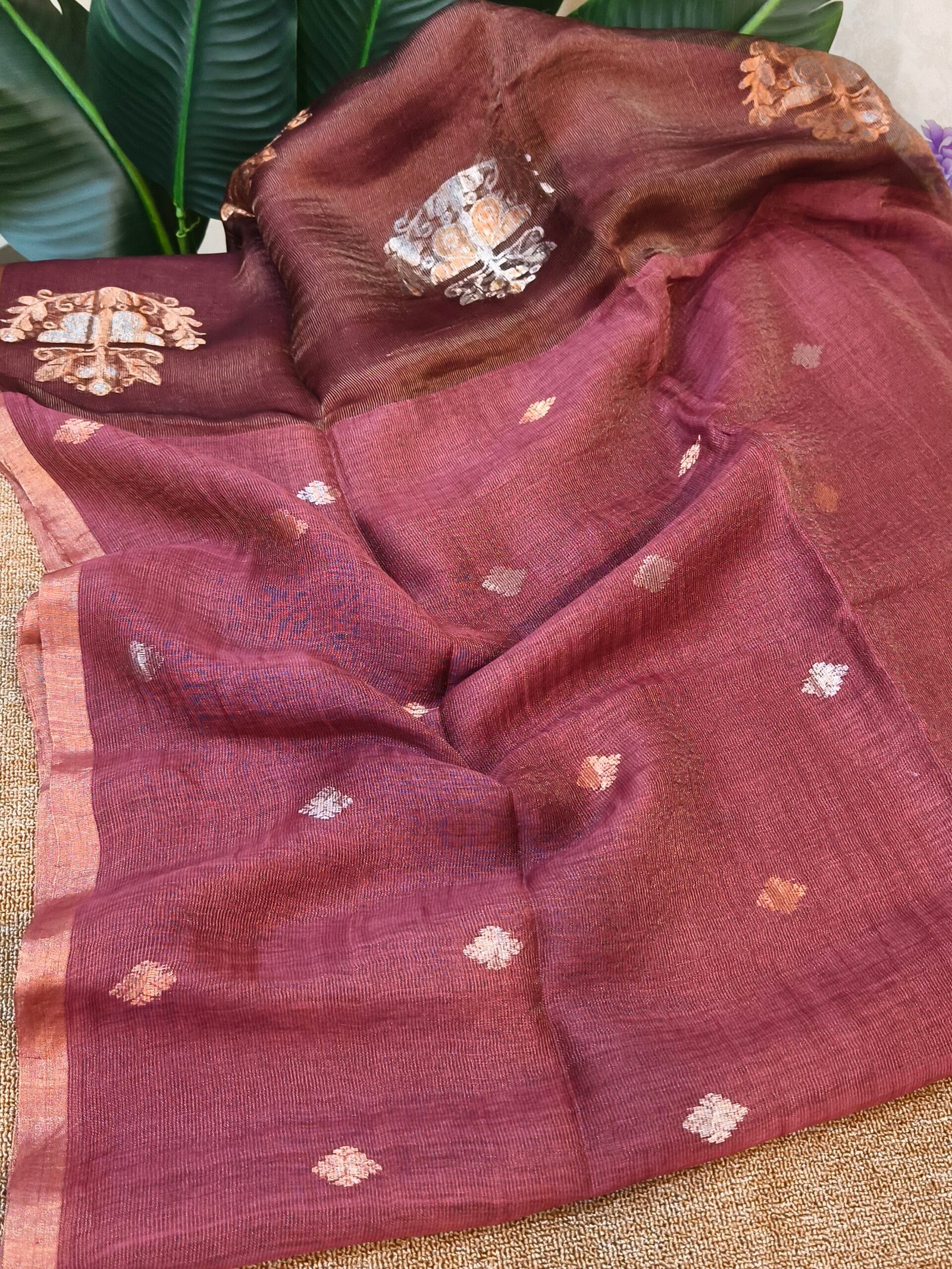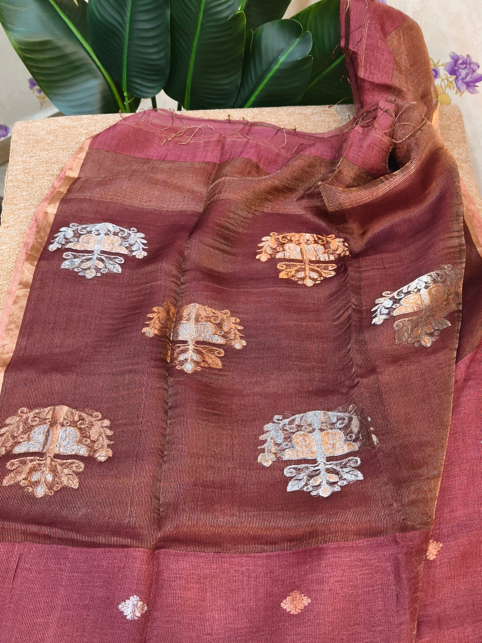 A handloom linen- tissue silk Jamdani saree is a premium, handcrafted garment that blends the rustic, airy texture of linen with the soft sheen and strength of silk, adorned with intricate, hand-woven Jamdani motifs.