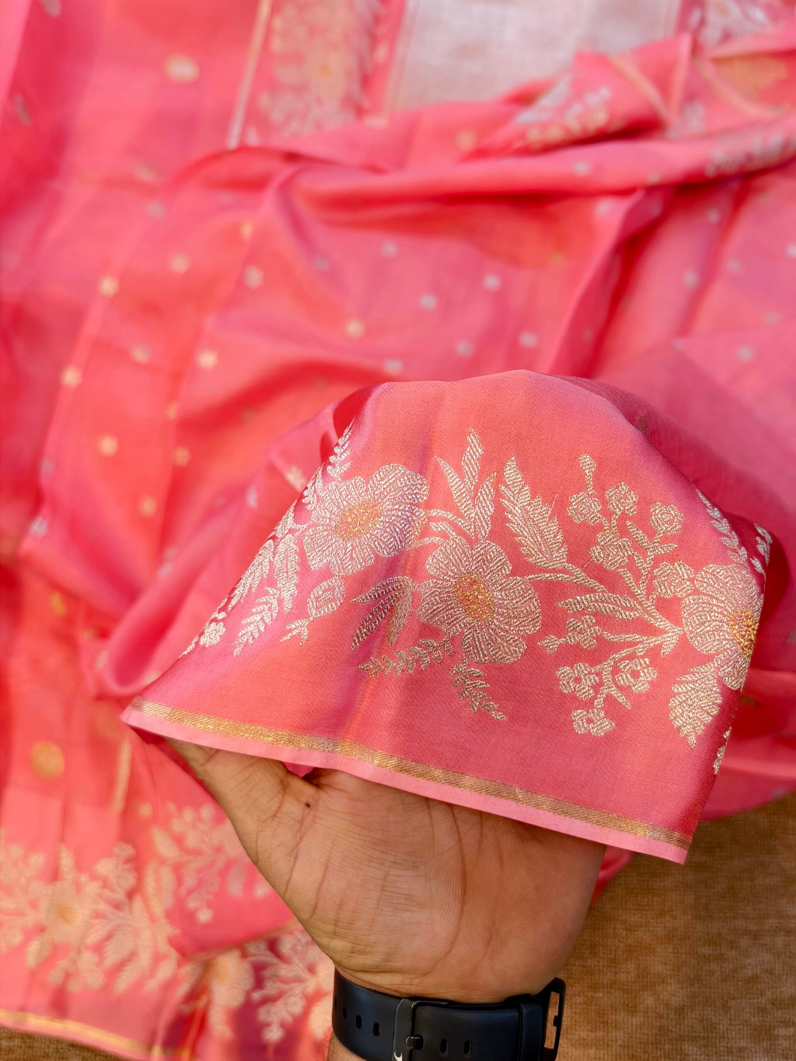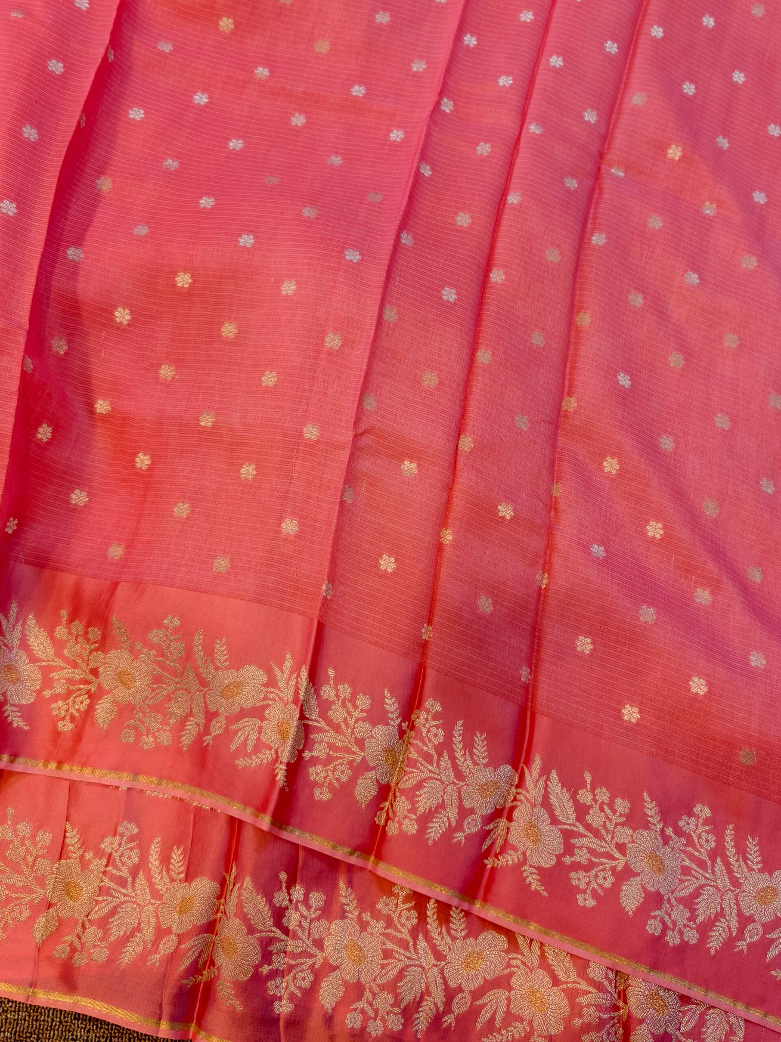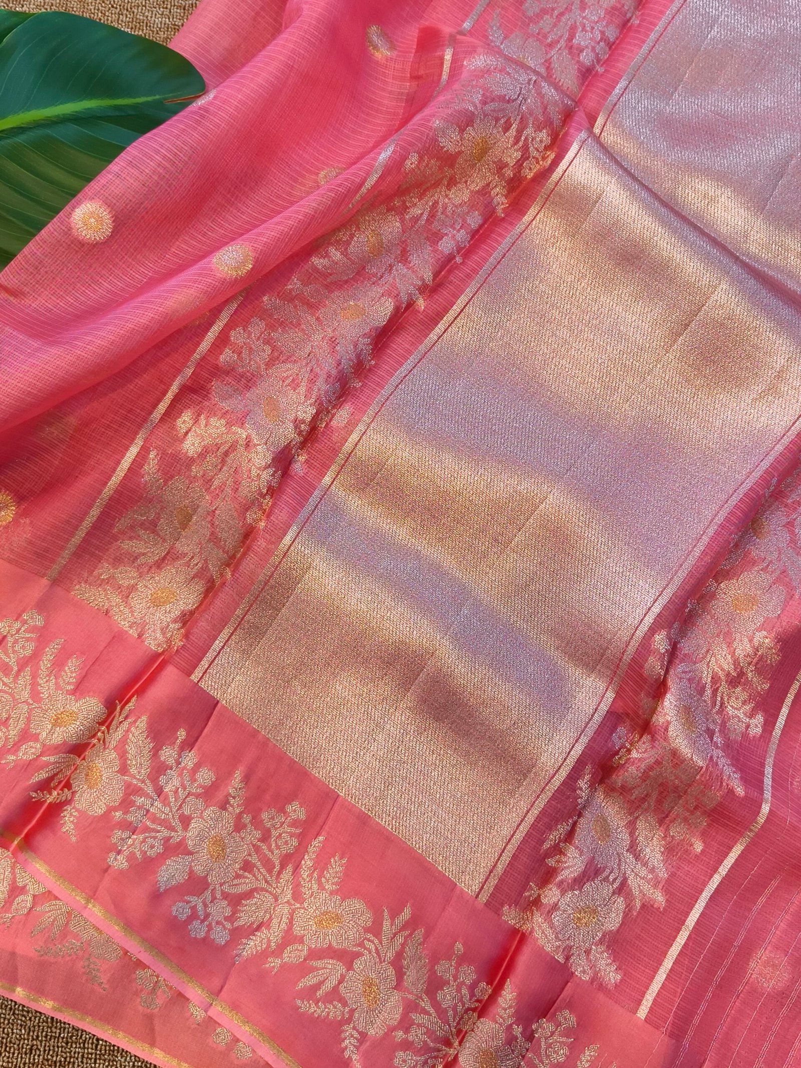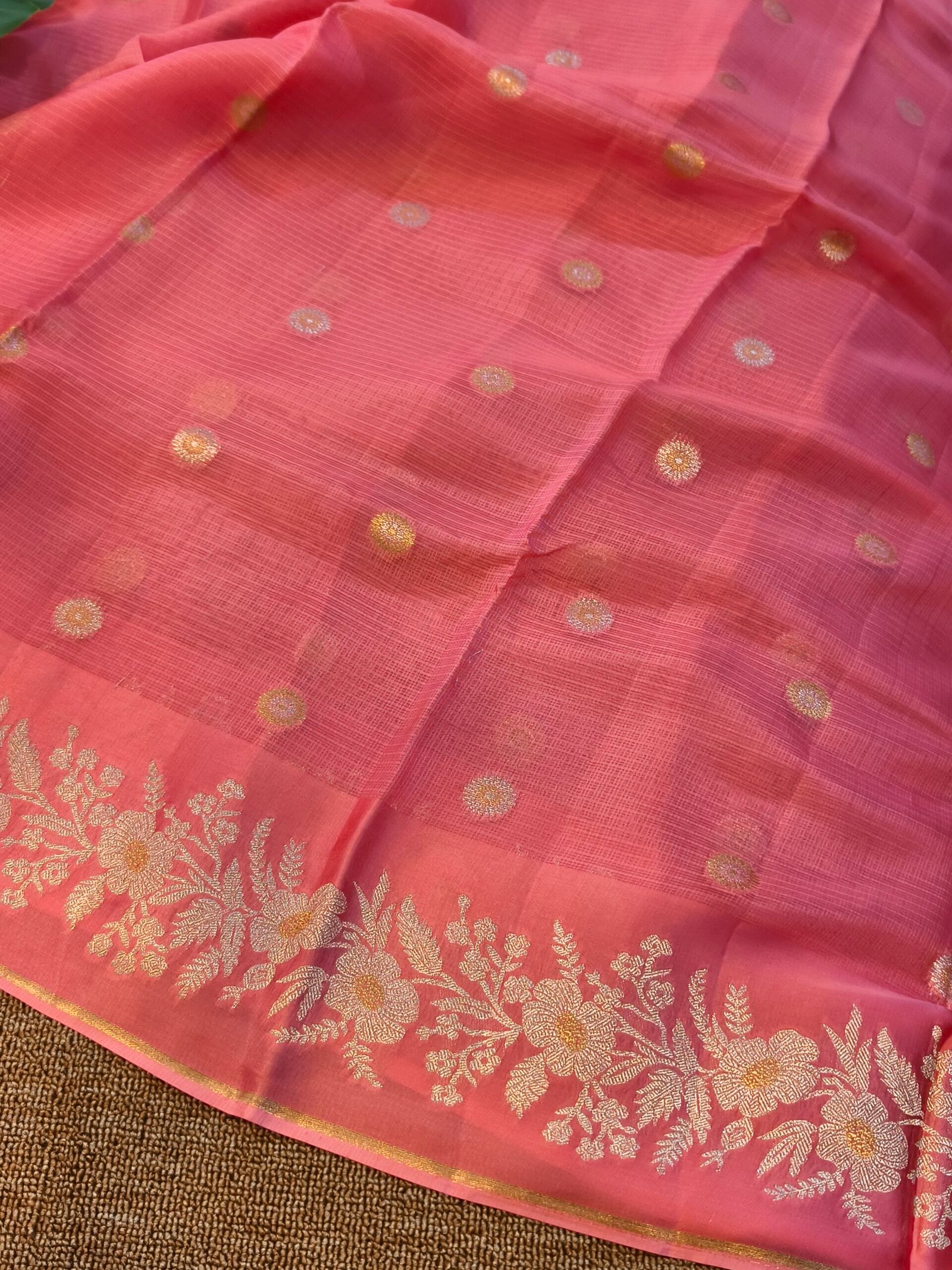 Crafted from fine Kota silk, also called Kota Doria silk — a blend of cotton and silk yarns that gives it a lightweight, airy feel.