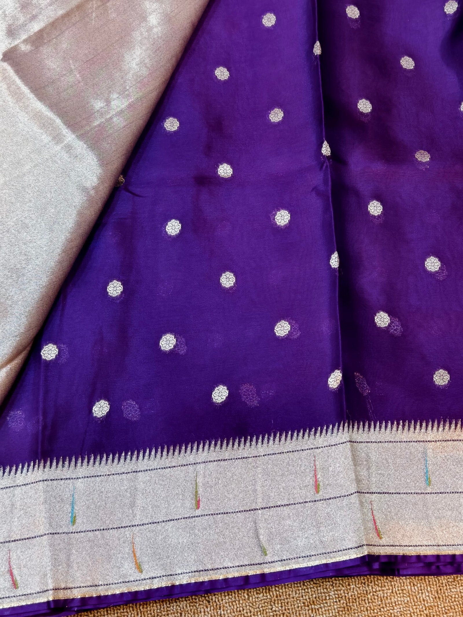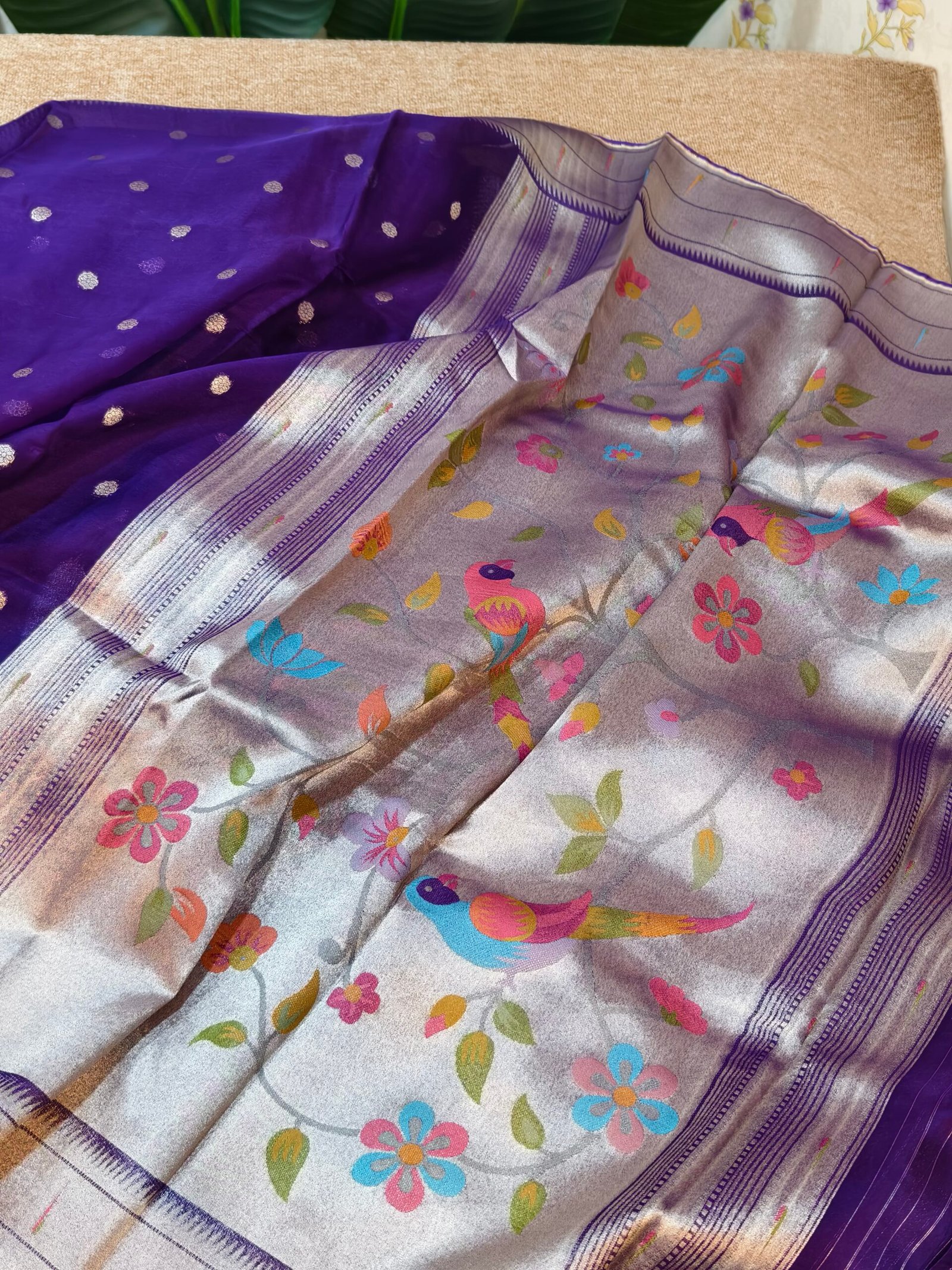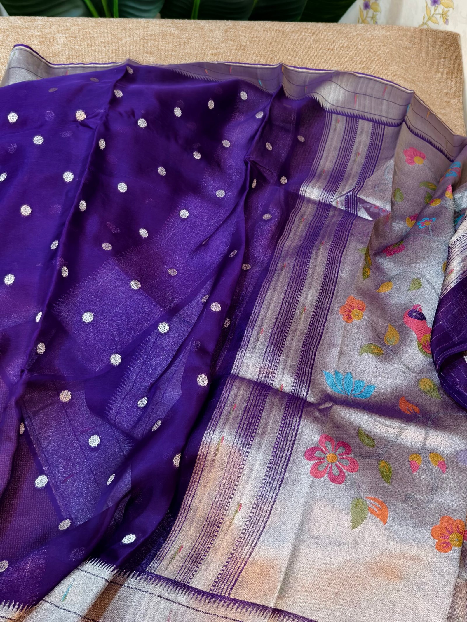 Draped in heritage and radiance, this Pura Organza Paithani Silk Saree is a masterpiece that merges traditional artistry with modern sophistication. Handwoven from pure organza silk — lightweight yet luxuriously textured — each thread reflects exquisite finesse and timeless charm.
