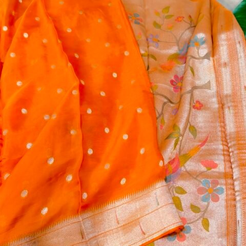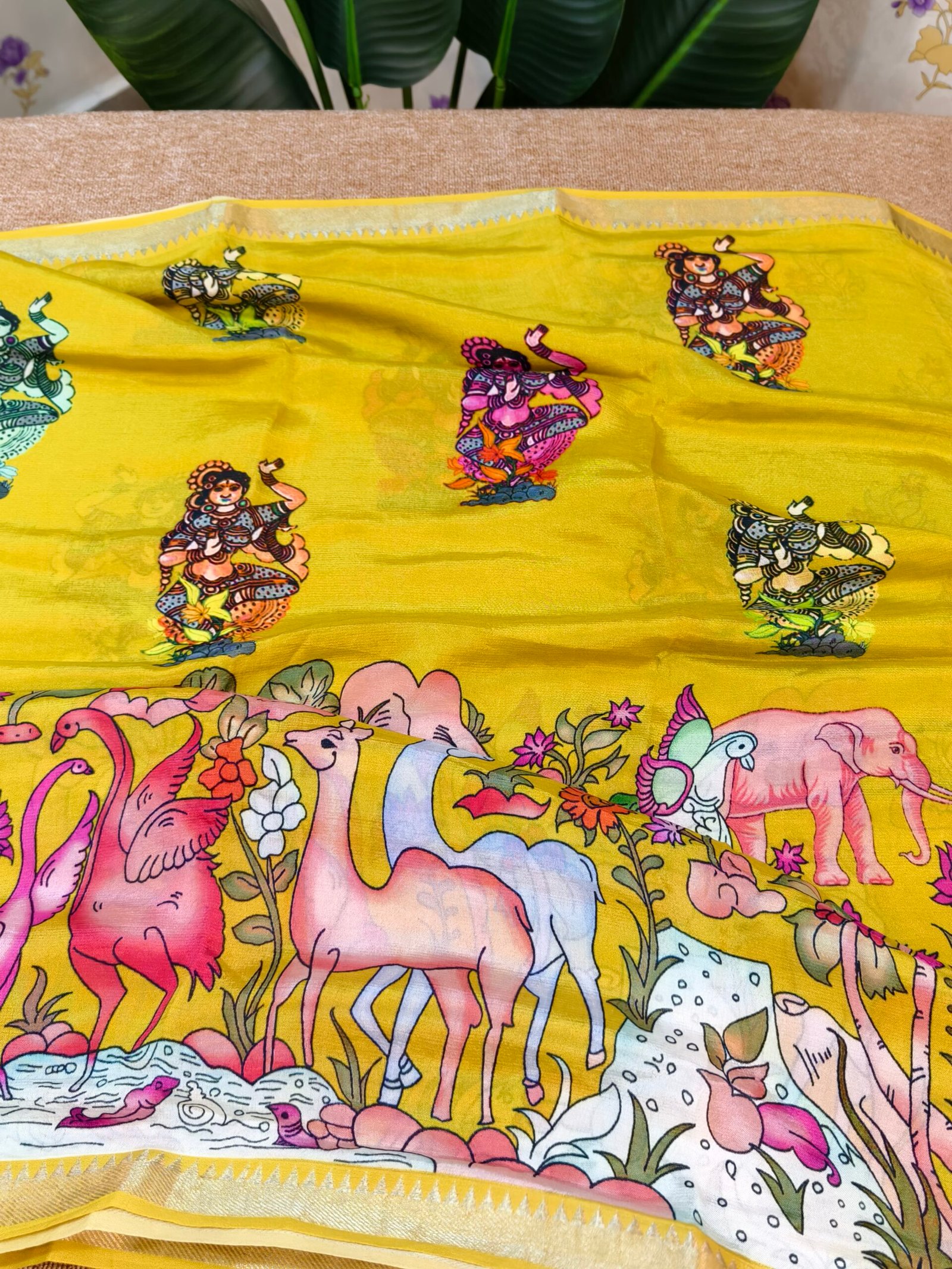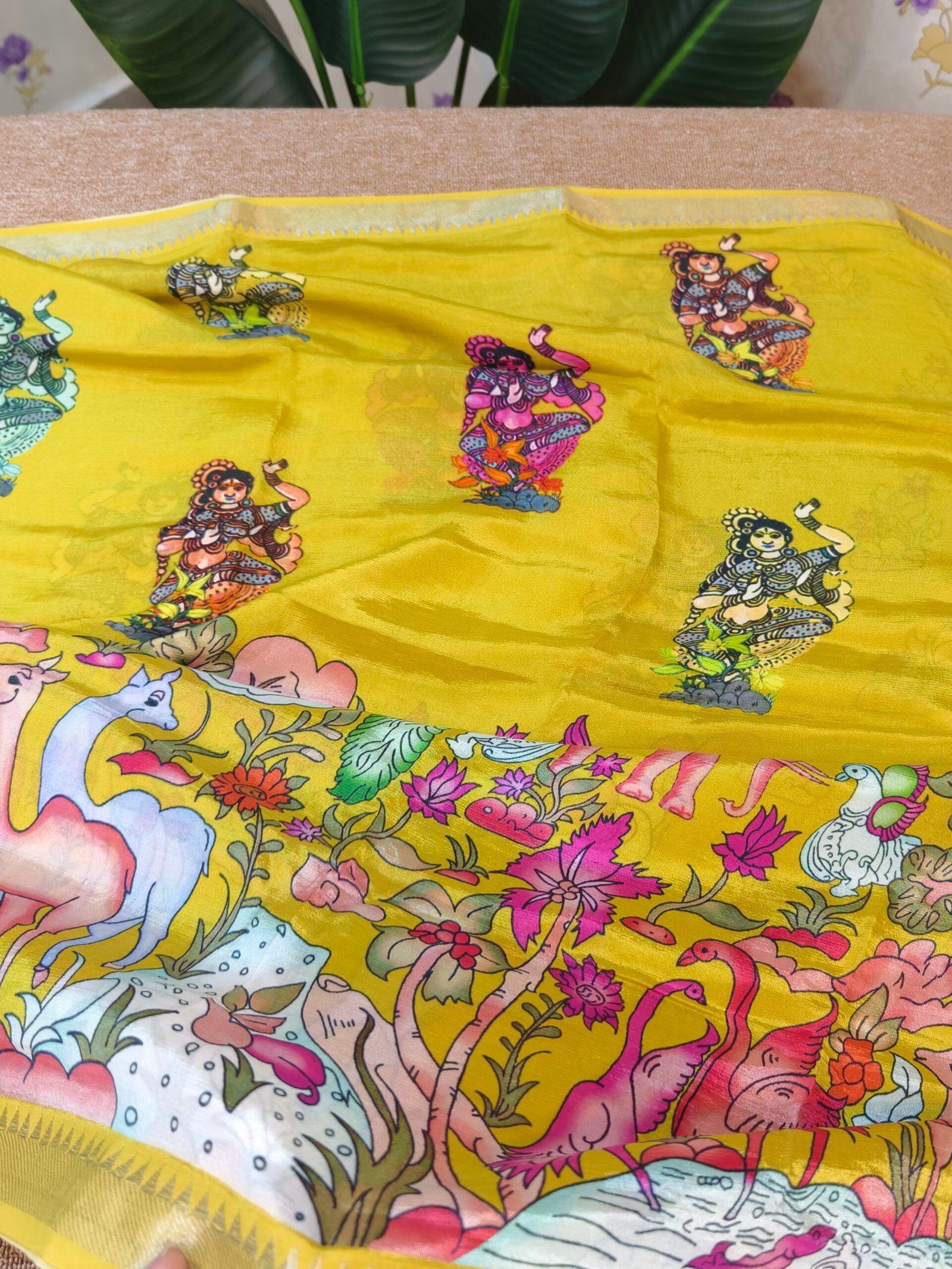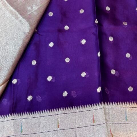 A mangalagiri is a traditional Indian saree known for its lightweight, sheer and shimmering fabric — the term “tissue” refers to its delicate, almost translucent texture. They are typically woven from fine silk blended with metallic threads (zari), which gives the saree its elegant shine and glossy finish.