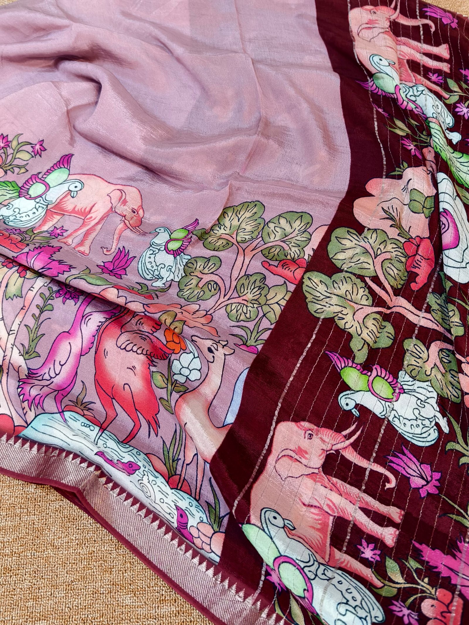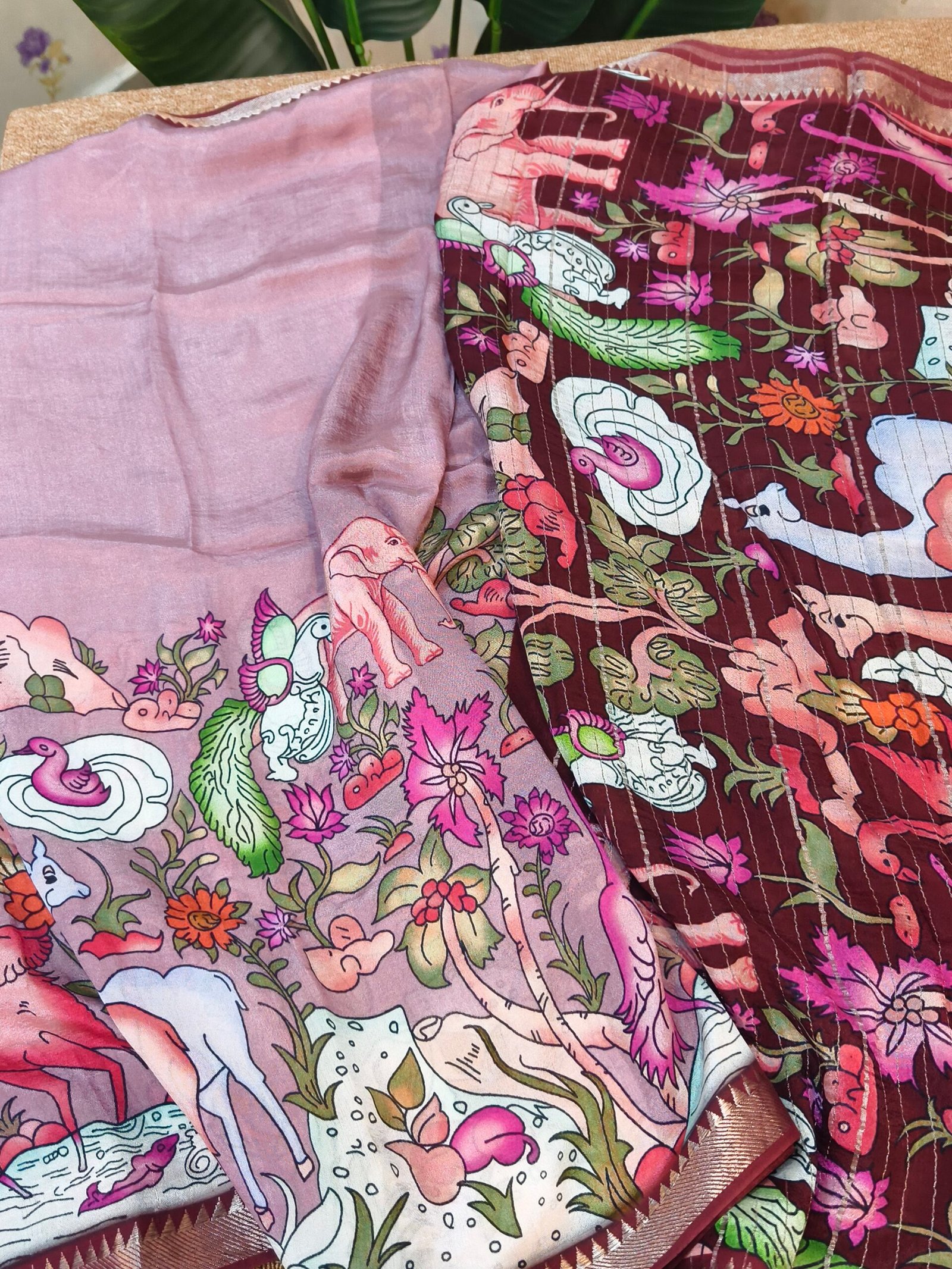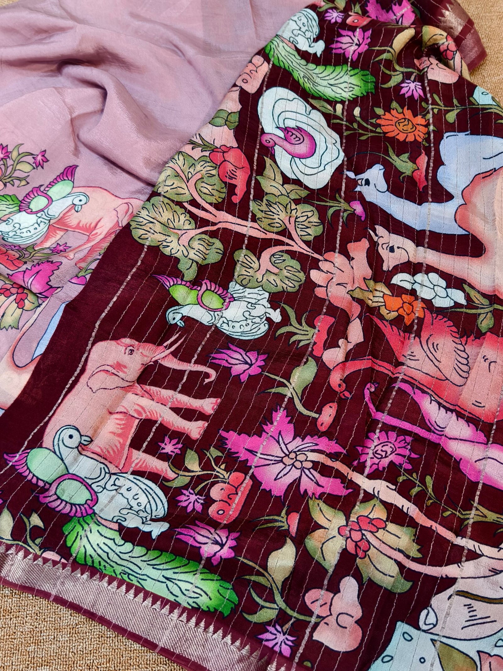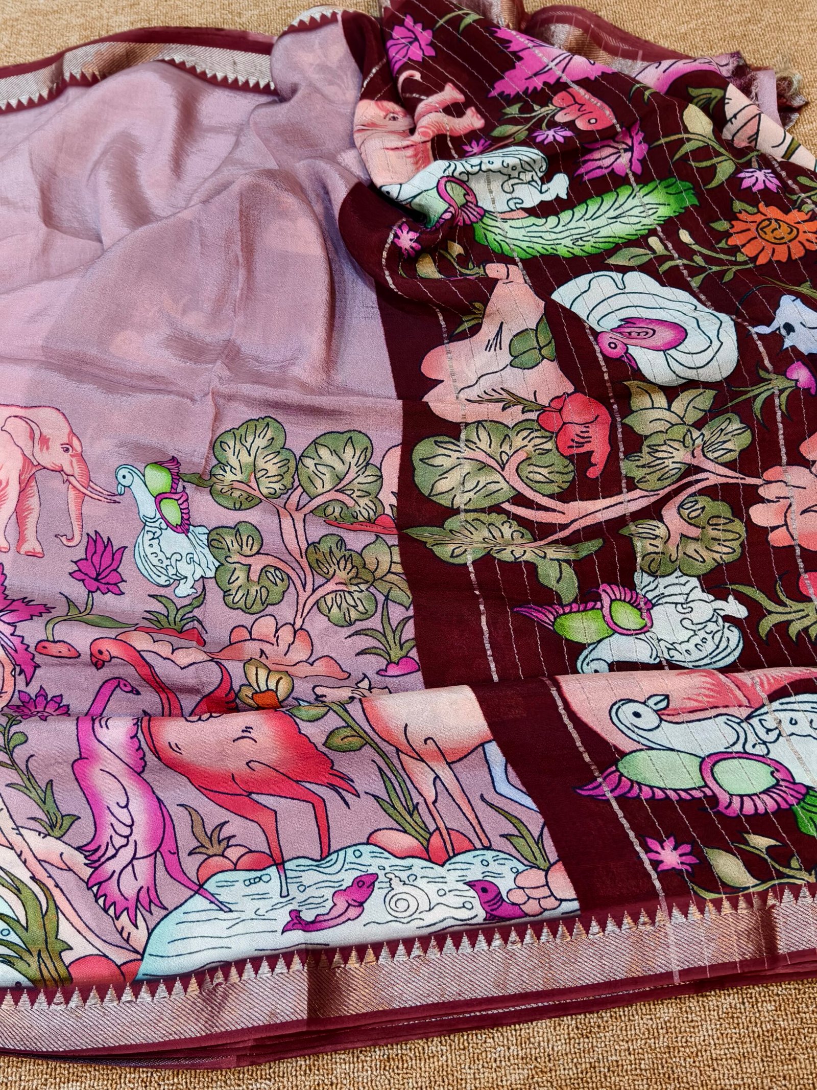 A mangalagiri is a traditional Indian saree known for its lightweight, sheer and shimmering fabric — the term “tissue” refers to its delicate, almost translucent texture. They are typically woven from fine silk blended with metallic threads (zari), which gives the saree its elegant shine and glossy finish.